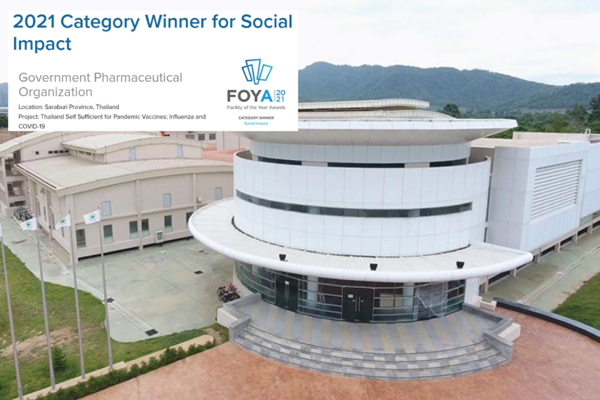 - 2021 Winner for Social Impact received by Government Pharmaceutical Organization (GPO) for its Thailand Self Sufficient for Pandemic Vaccines; Influenza and COVID-19 project in Saraburi Province, Thailand.